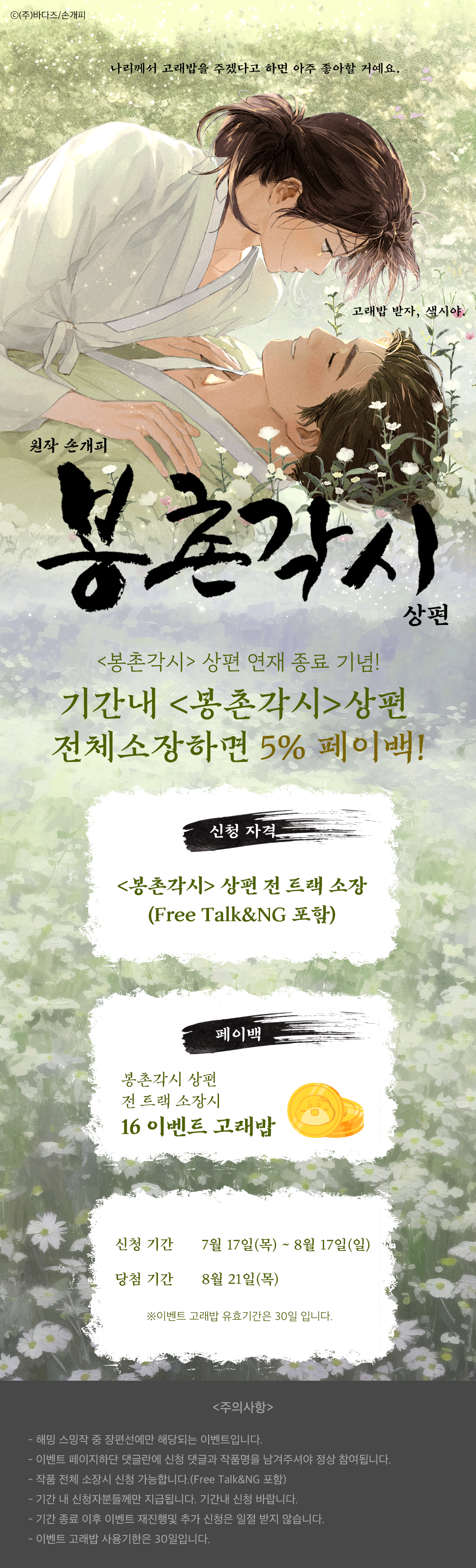 - [연재 종료 이벤트] 봉촌각시 상편 페이백! 2025-07-17 19:04~2025-08-18 00:00